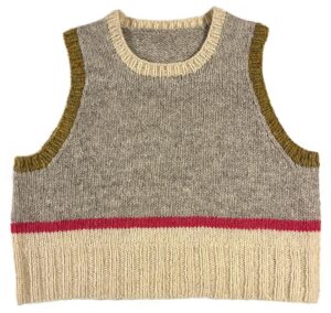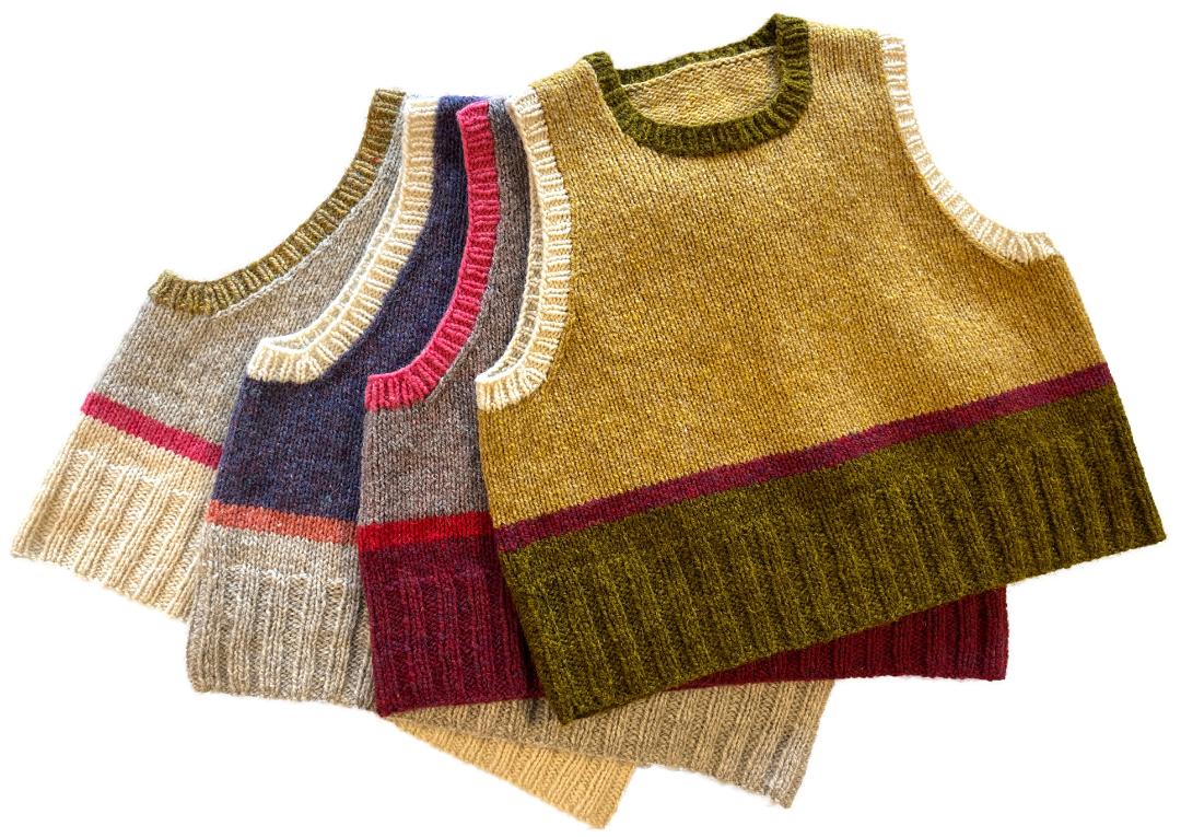 The Somerset Vest bridges the gap between the seasons…fall to winter-winter to spring…Wearing a Somerset Vest knit from our colorful yarns is cozy, joyful and just plain fun! Sleeveless is the style so it is comfortable in our coats.